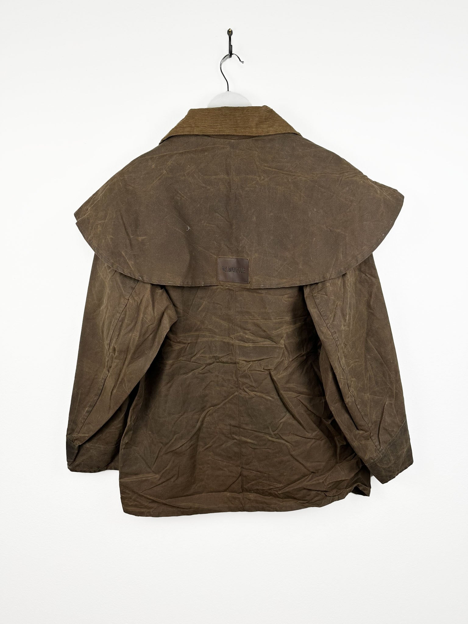 La giacca Barbour mostra i classici segni di invecchiamento del cotone cerato.