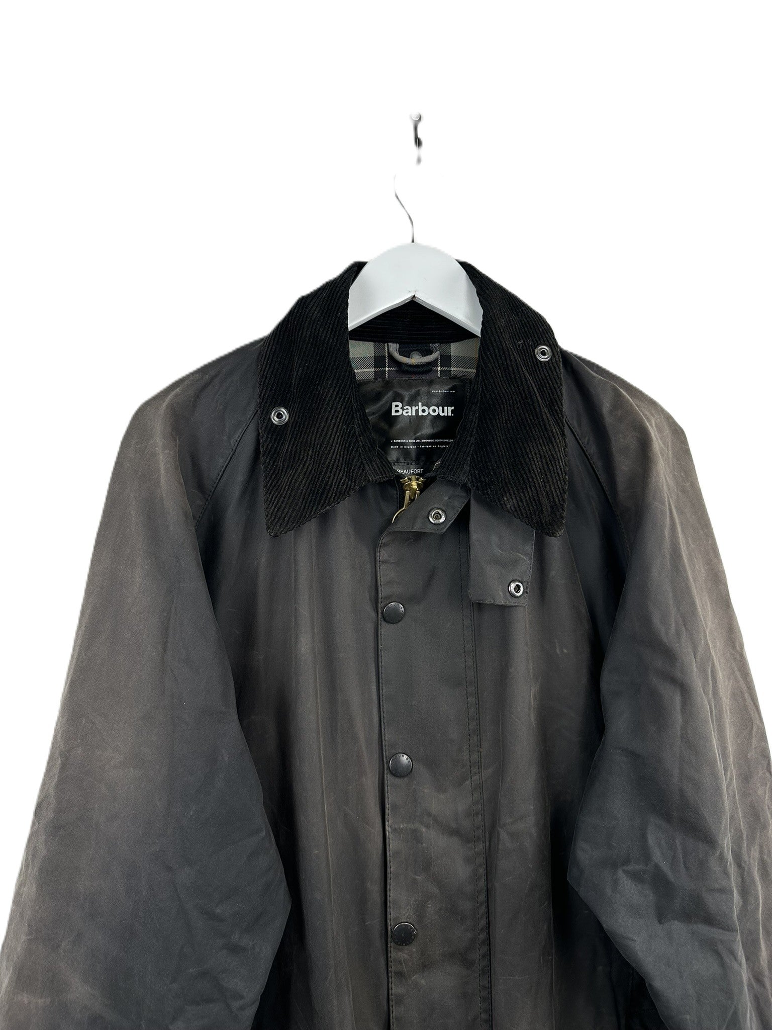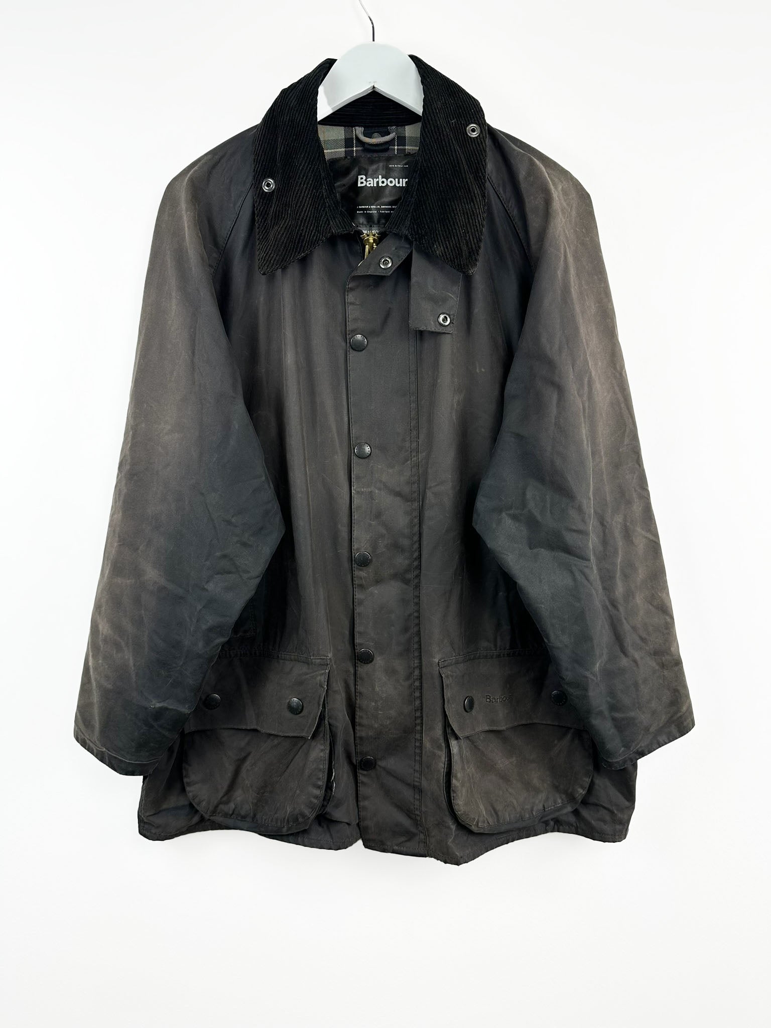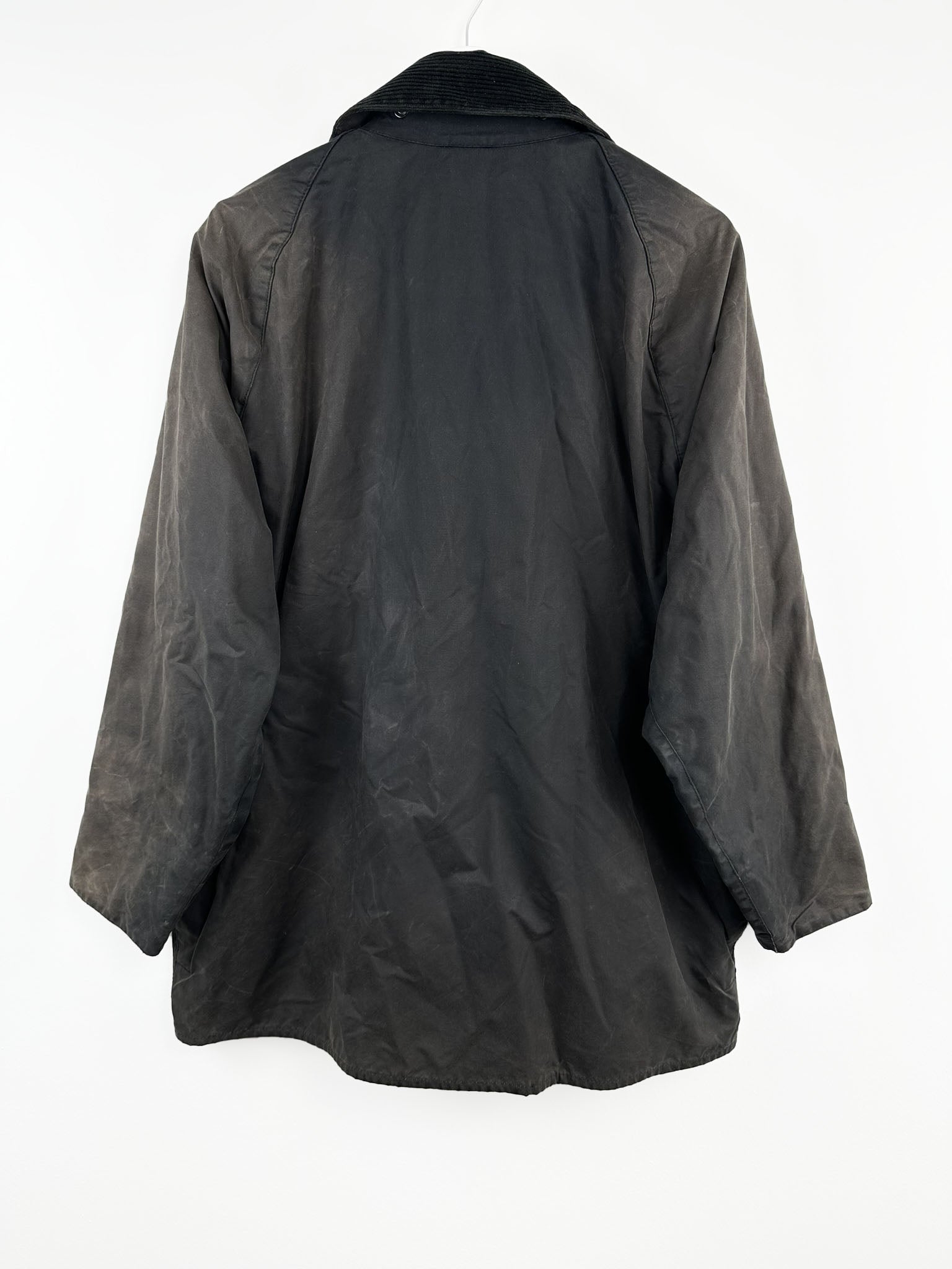 La giacca Barbour mostra i classici segni di invecchiamento del cotone cerato, che possono essere considerati un valore aggiunto.