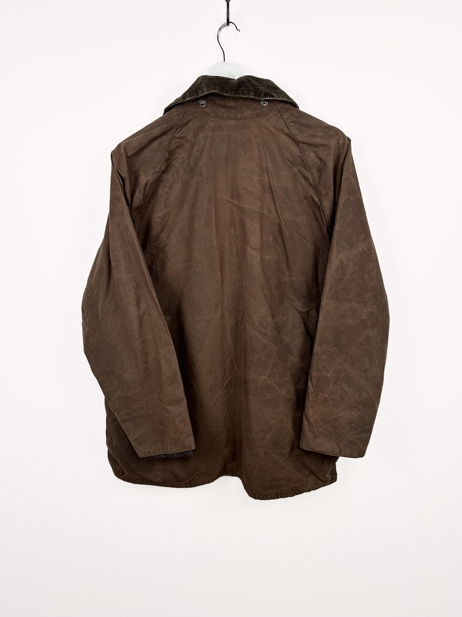 - Fronte: La giacca Barbour mostra i classici segni di invecchiamento del cotone cerato