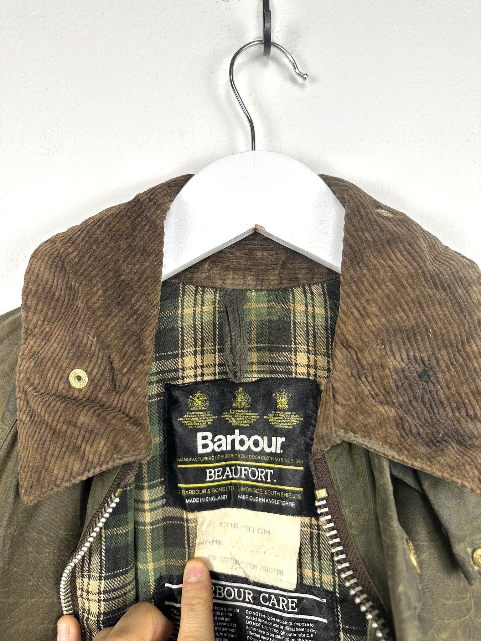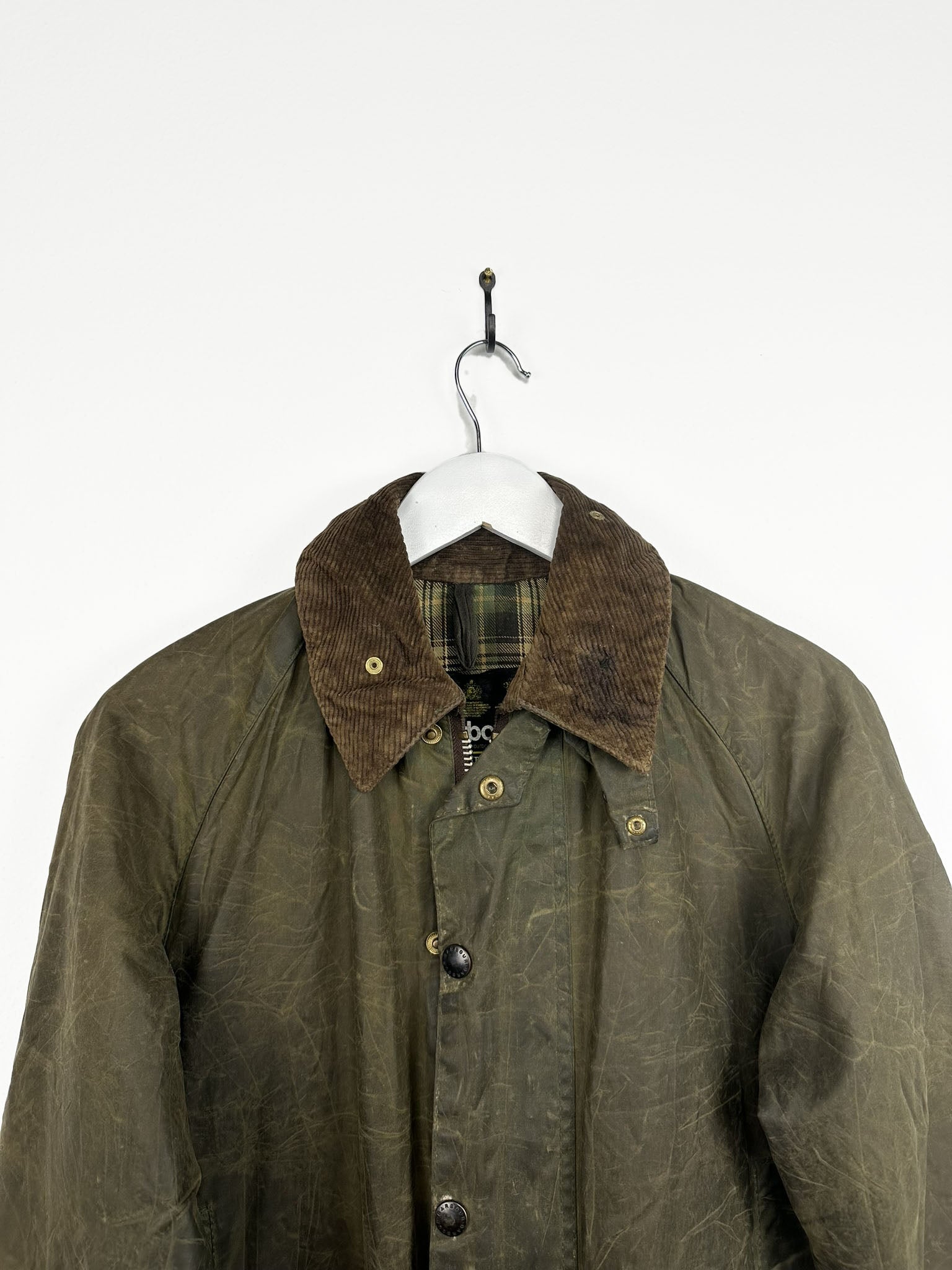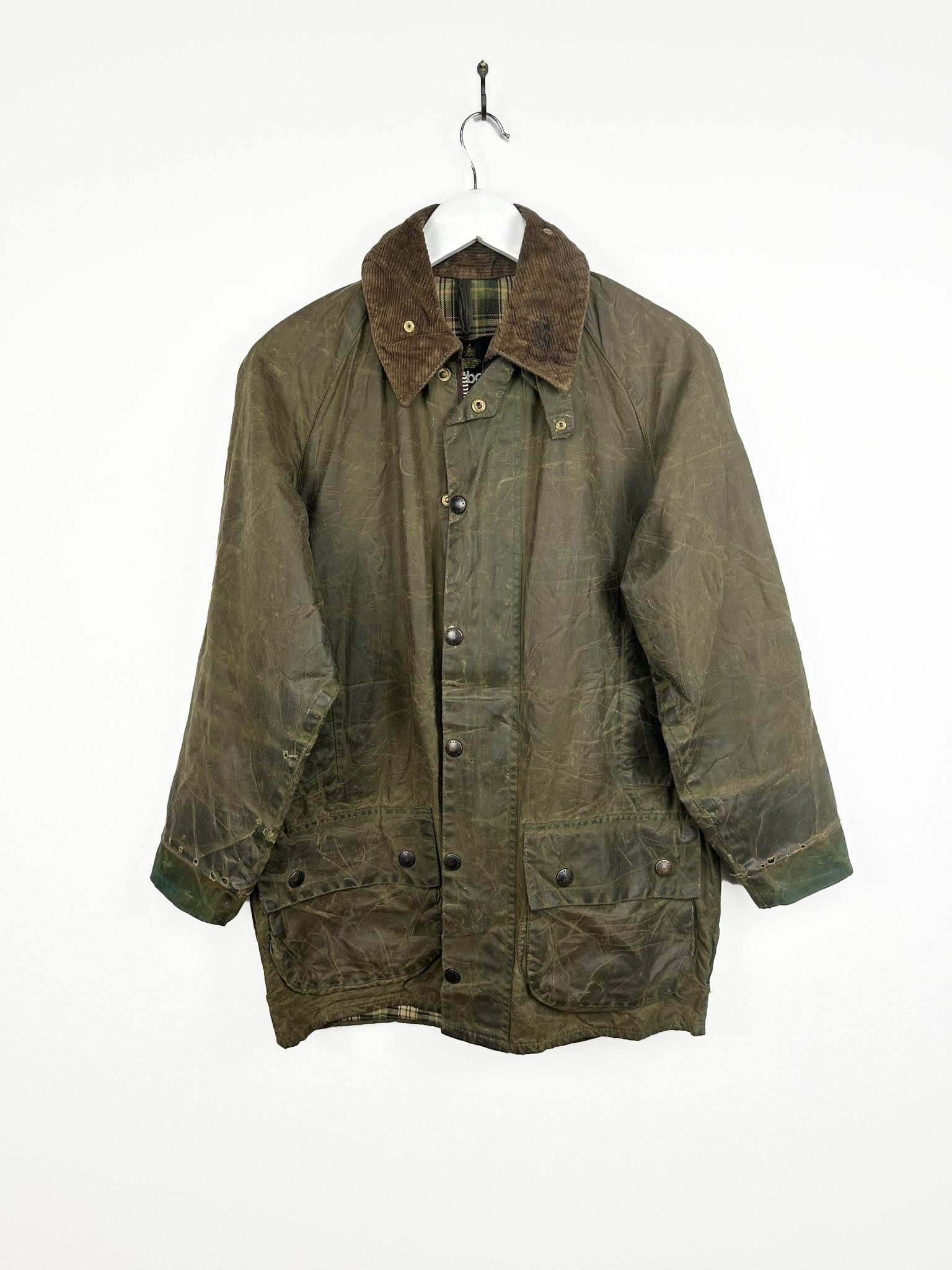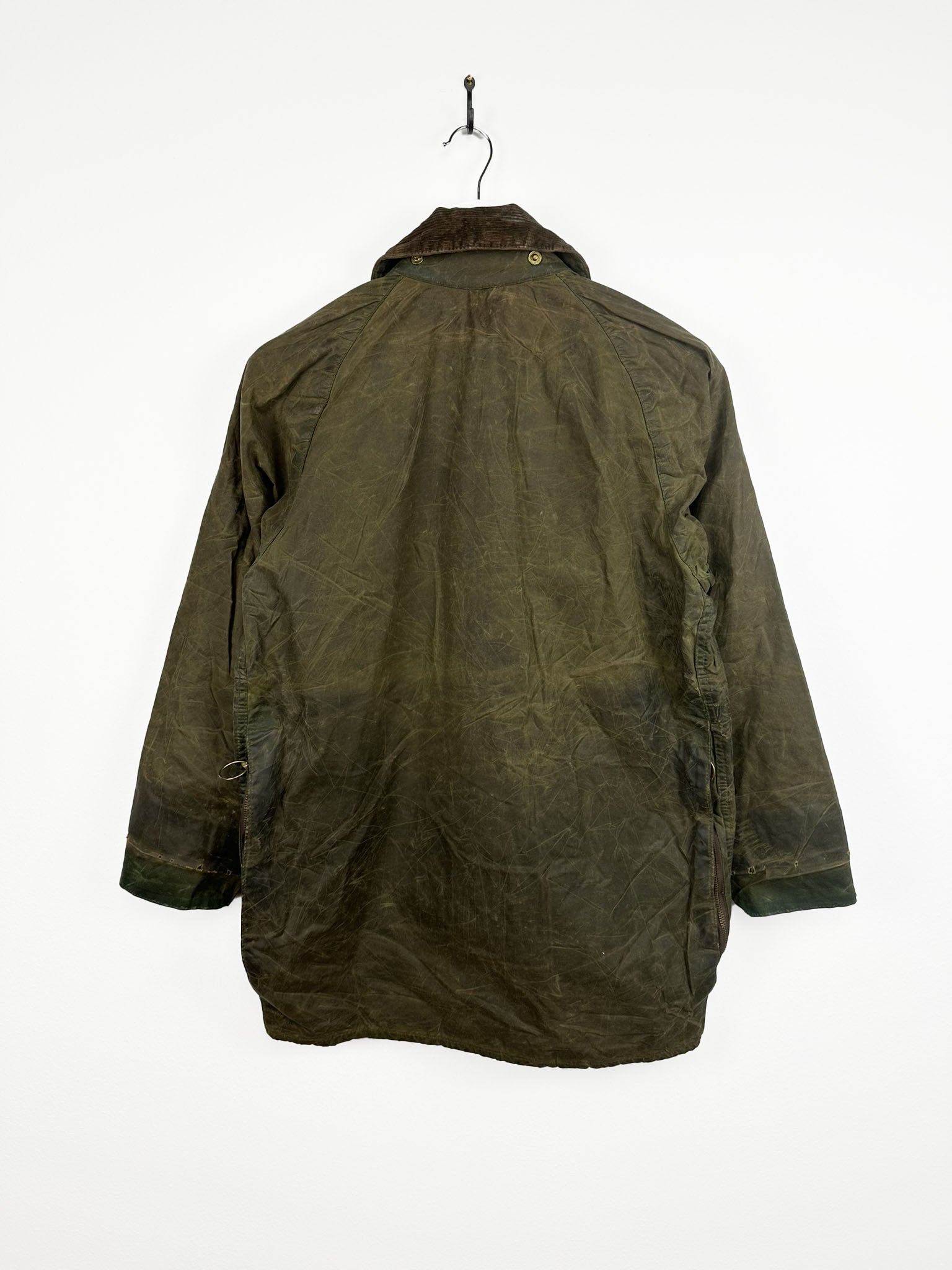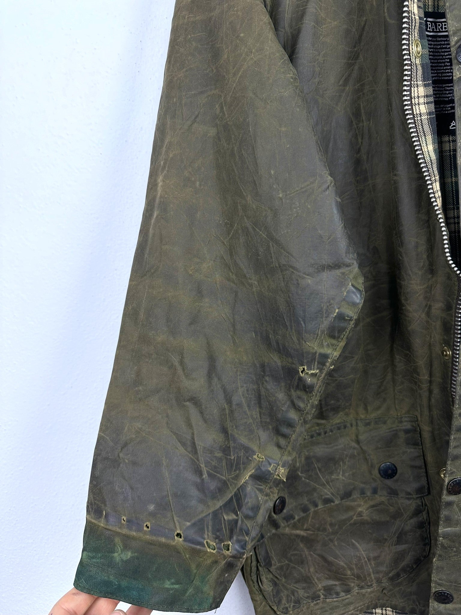 La giacca Barbour mostra i classici segni di invecchiamento del cotone cerato. Presenta dei buchi sulle maniche.