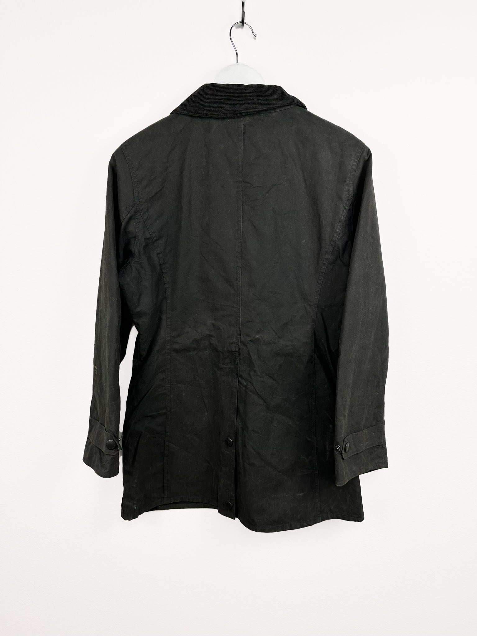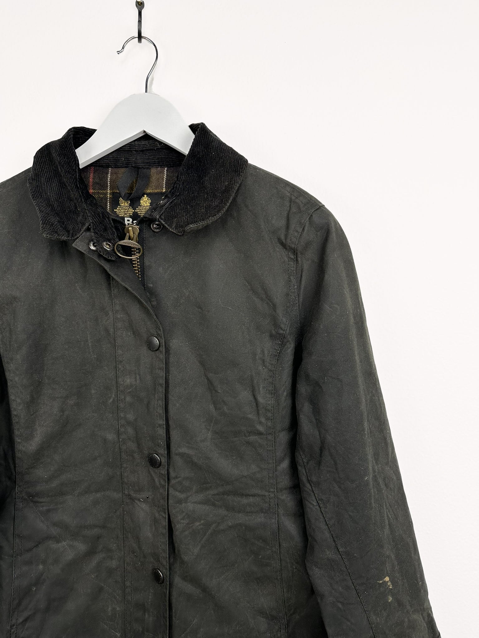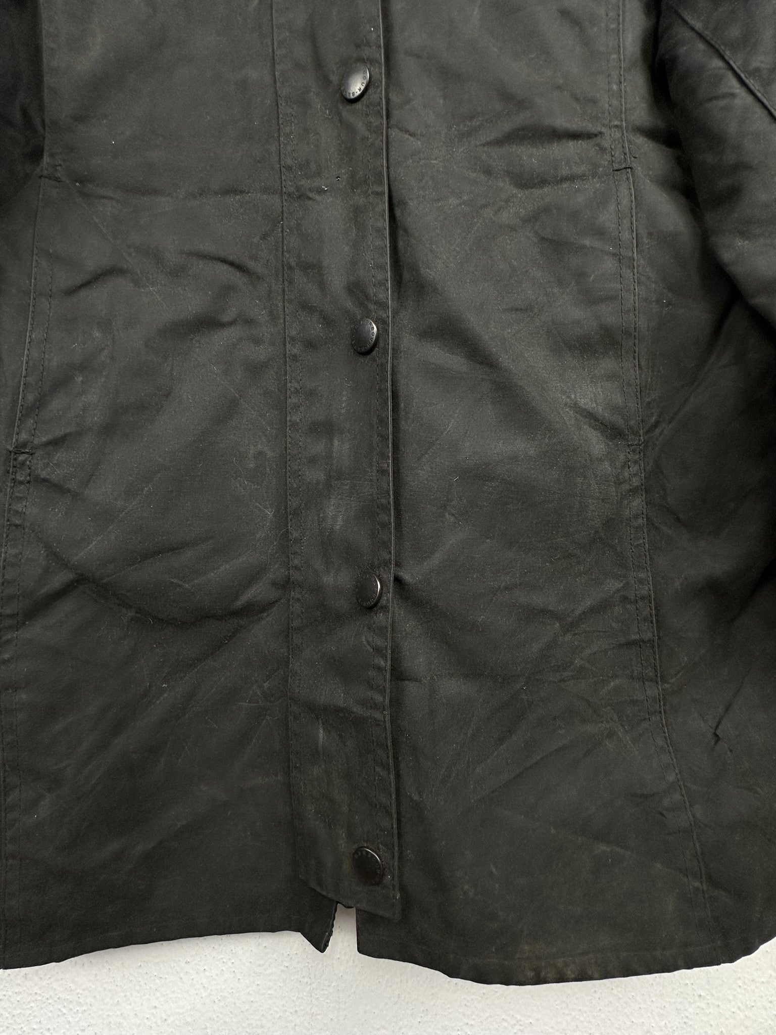 La giacca Barbour mostra i classici segni di invecchiamento del cotone cerato, presente una macchia sulla manica sinistra e presenta dei segni di usura sul davanti.