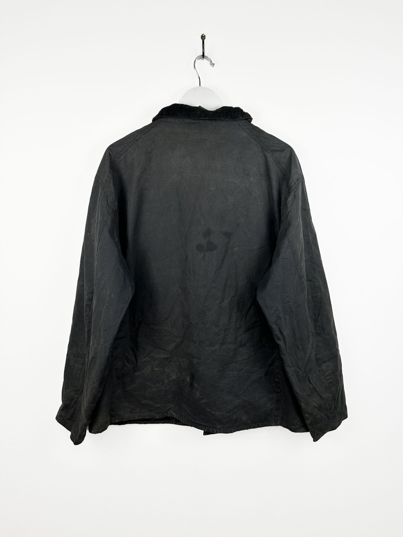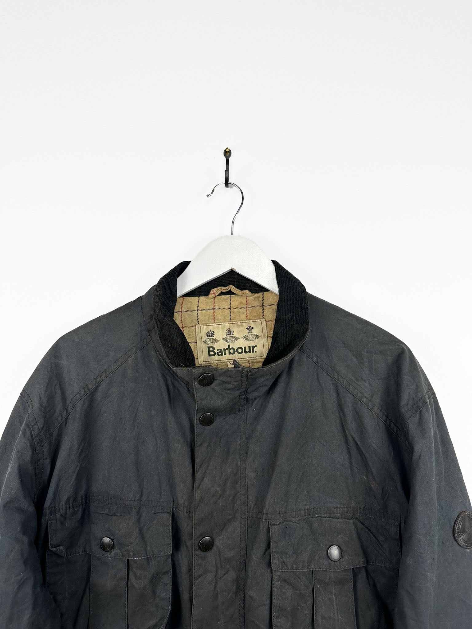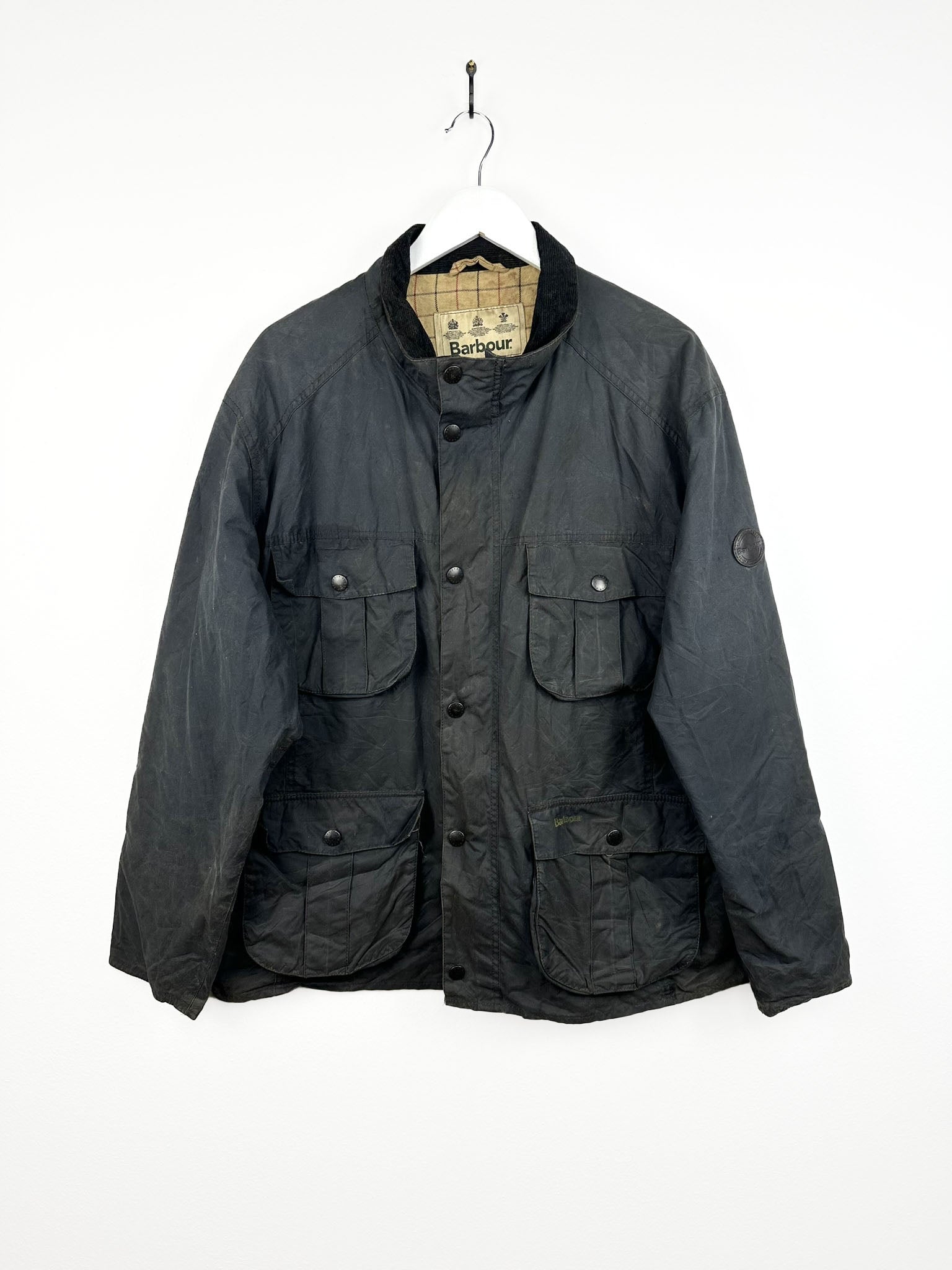 La giacca Barbour mostra i classici segni di invecchiamento del cotone cerato.