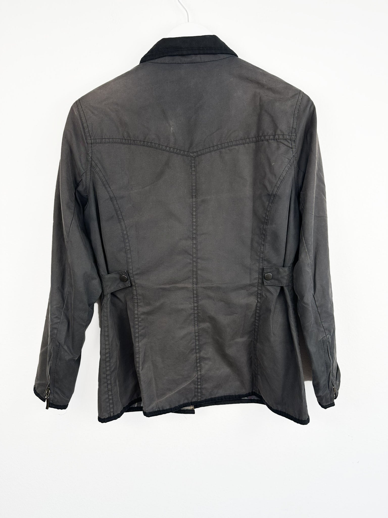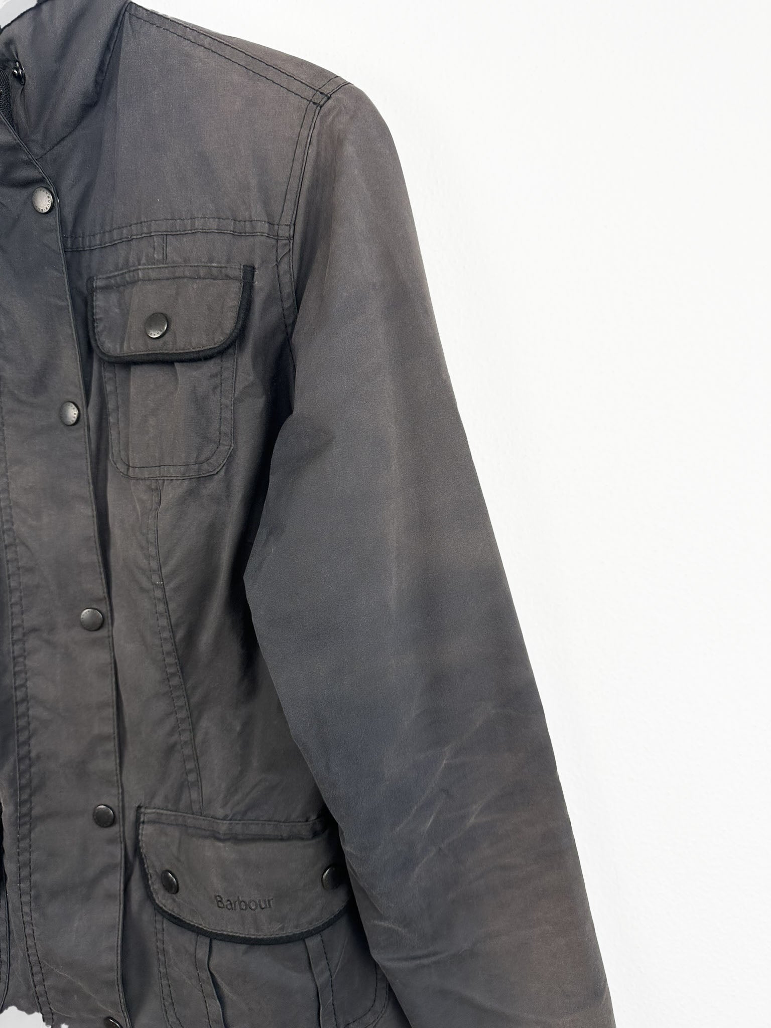 La giacca Barbour mostra i classici segni di invecchiamento del cotone cerato.